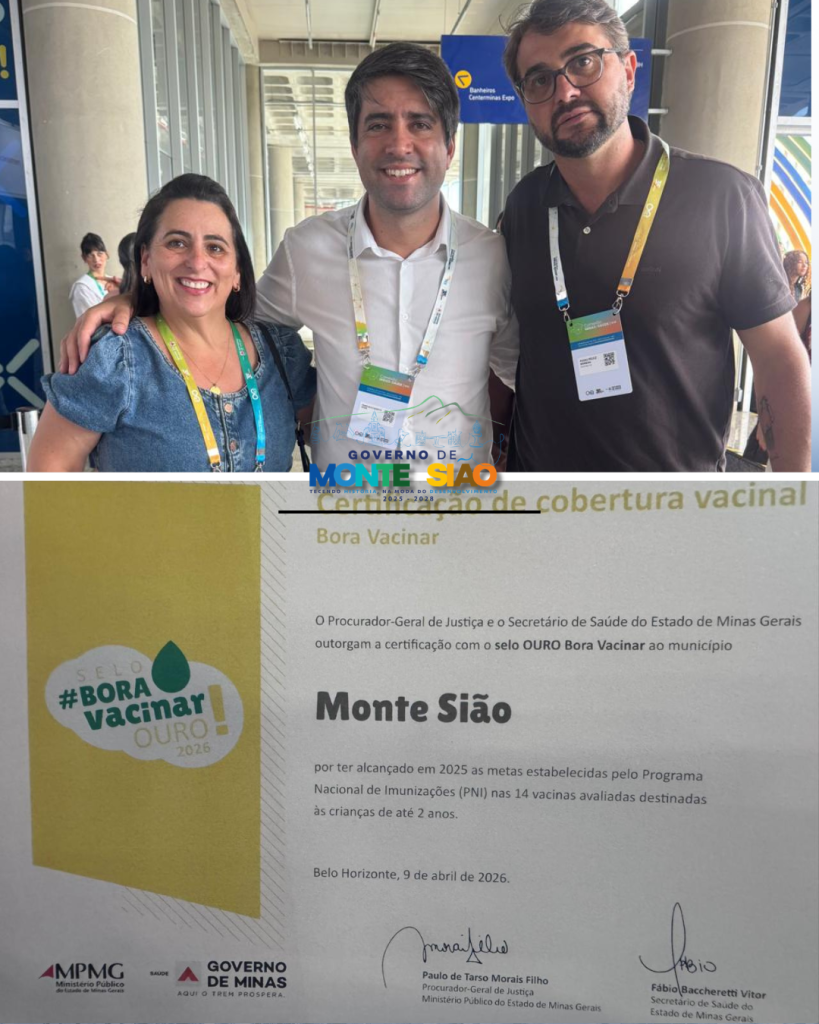 O Selo Ouro é para municípios que atingiram as metas de todas as 14 vacinas monitoradas, assim como Monte Sião.